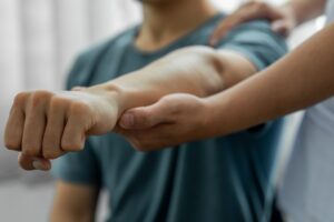 - その状態のまま、手首を小指側に曲げます。親指の筋がストレッチされて、少し痛みを感じると思います。